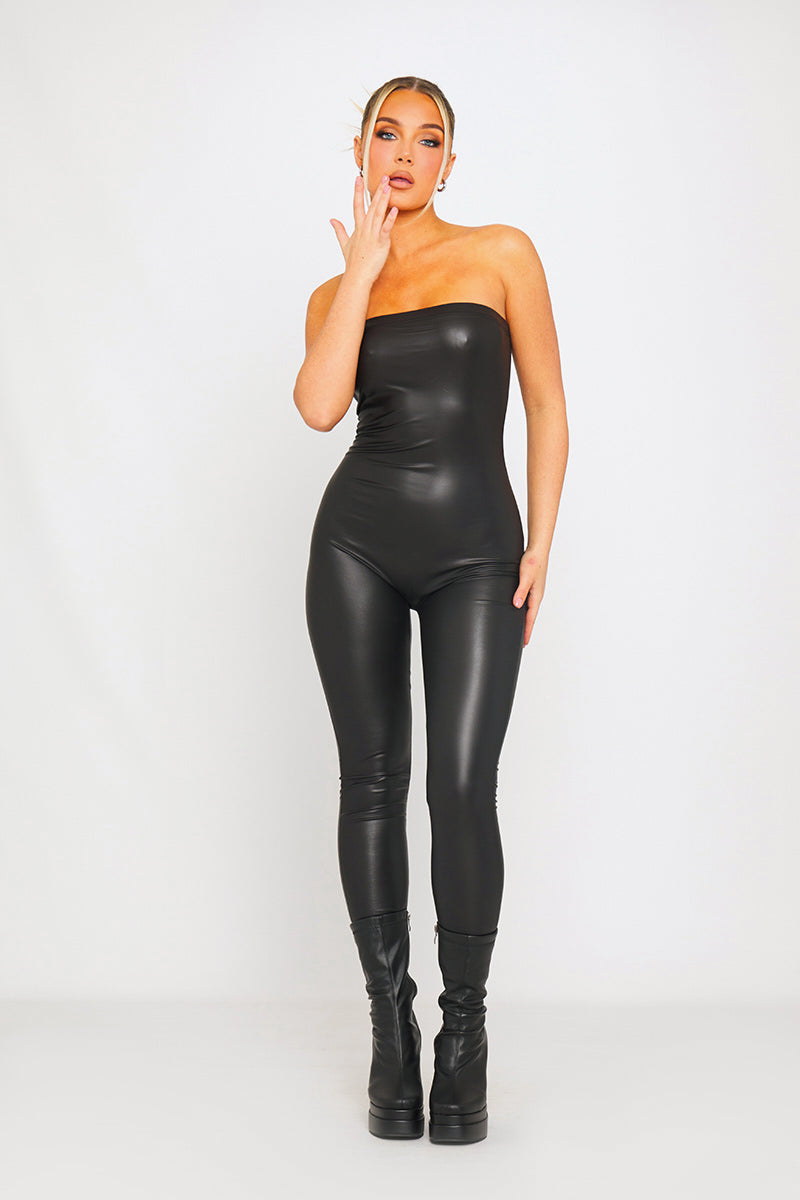Black Faux Leather Bandeau Sleeveless Jumpsuit