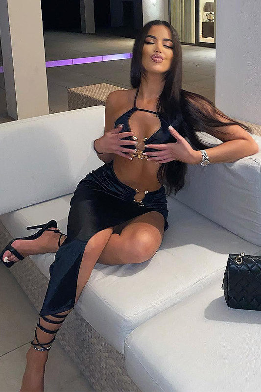 Black Hammered Trim Halter Top & Slit Midi Skirt Co-Ord