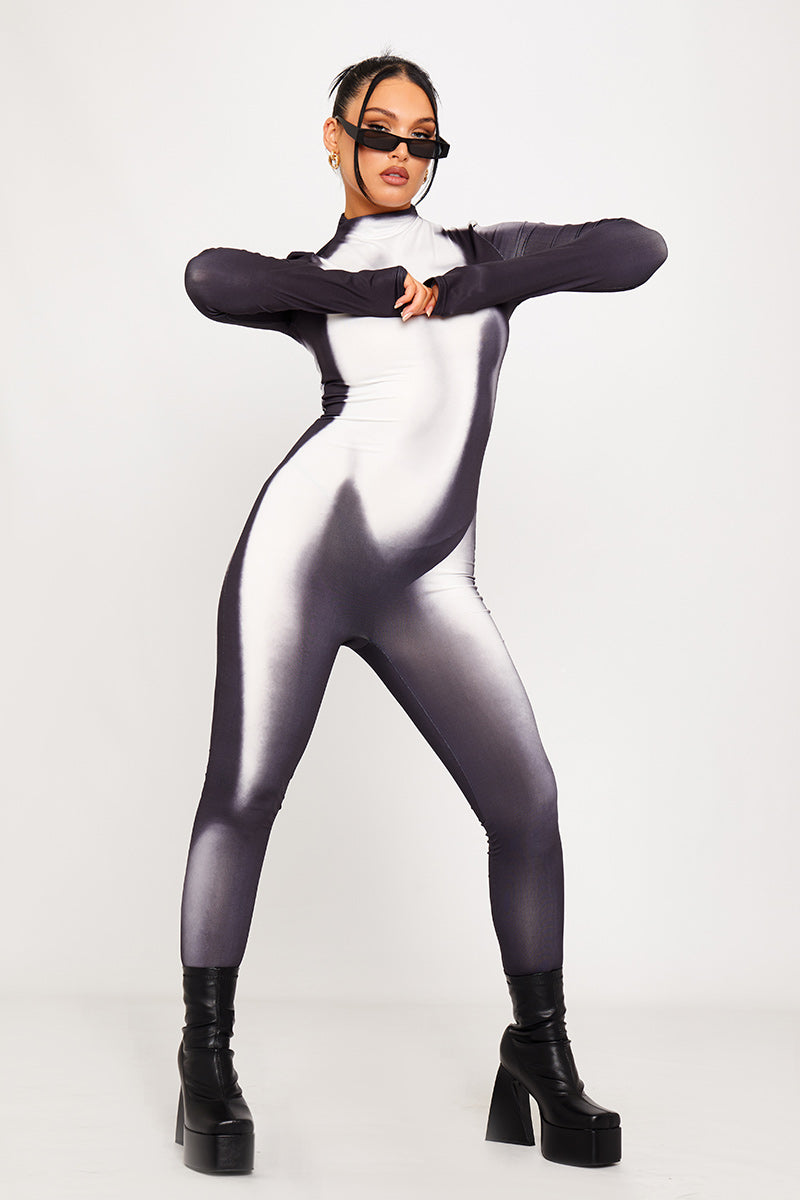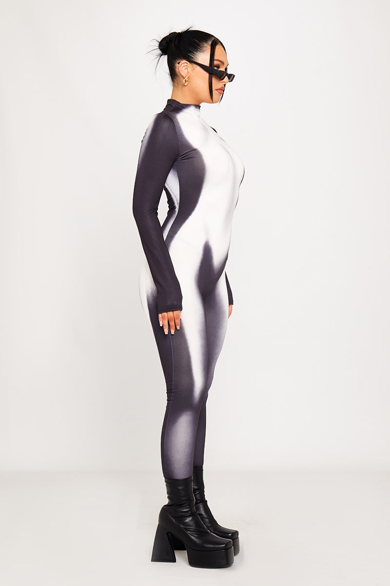 Black High Neck Body Print Long Sleeve Jumpsuit