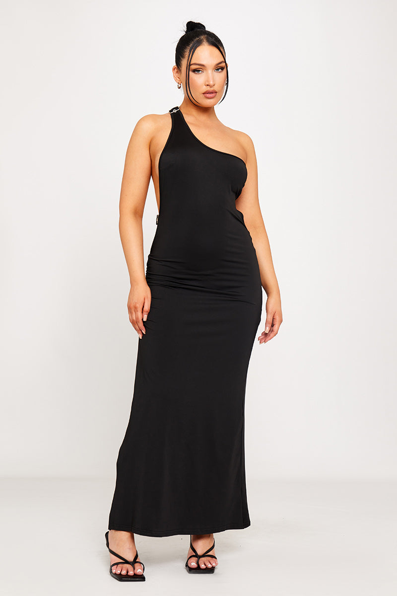 Black One Shoulder Buckle Detail Open Back Maxi Dress