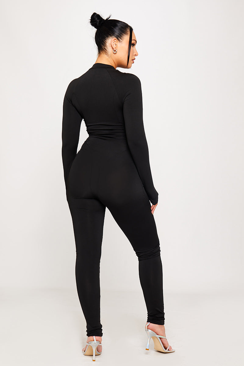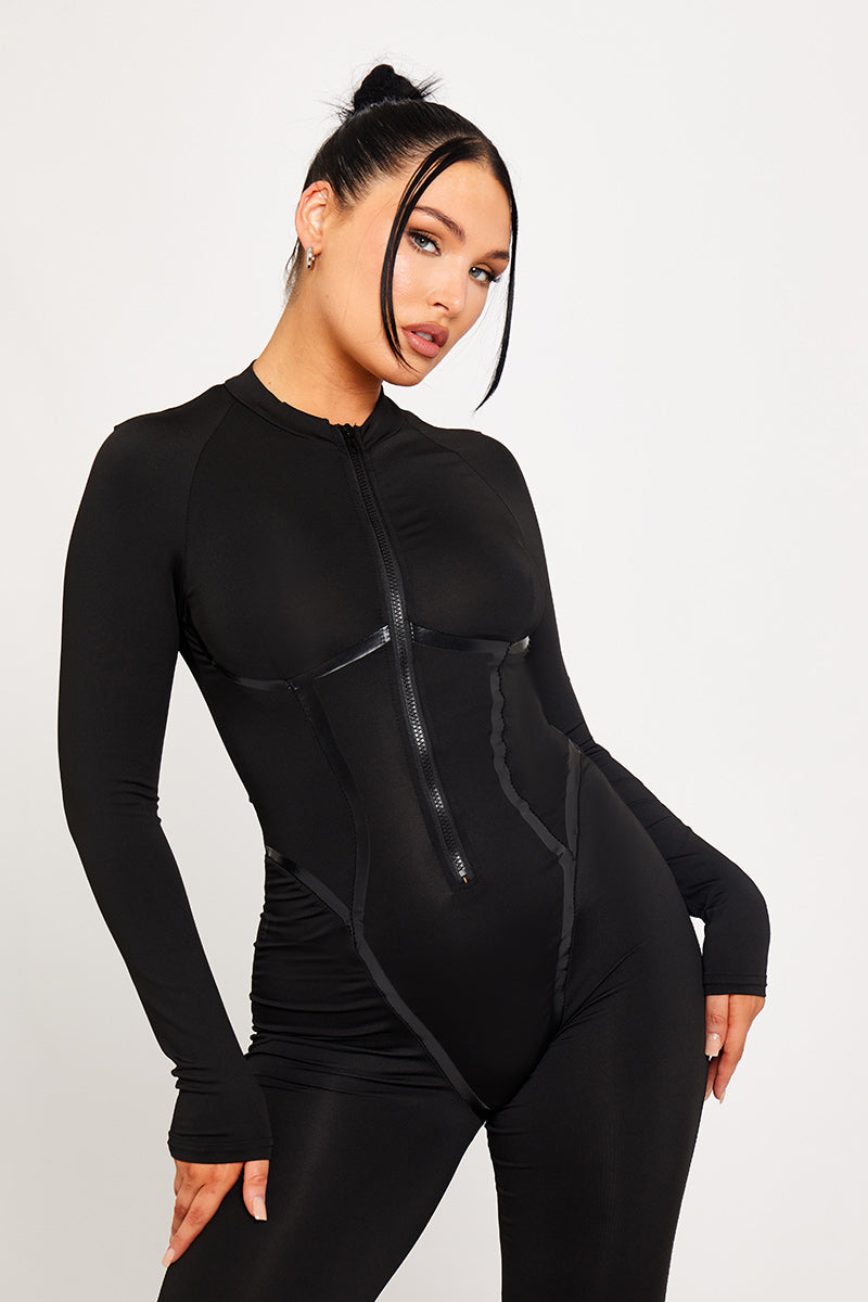 Black Zip Front Corset Detail Long Sleeve Jumpsuit