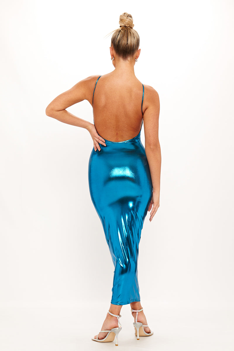 Blue Metallic Sleeveless Backless Bodycon Midaxi Dress