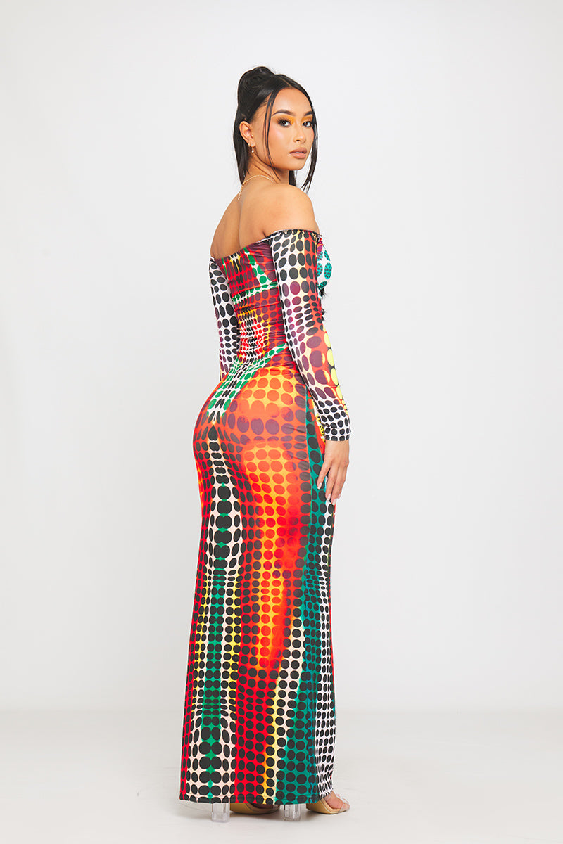 Multi Polka Dot Print Off Shoulder Long Sleeve Maxi Dress